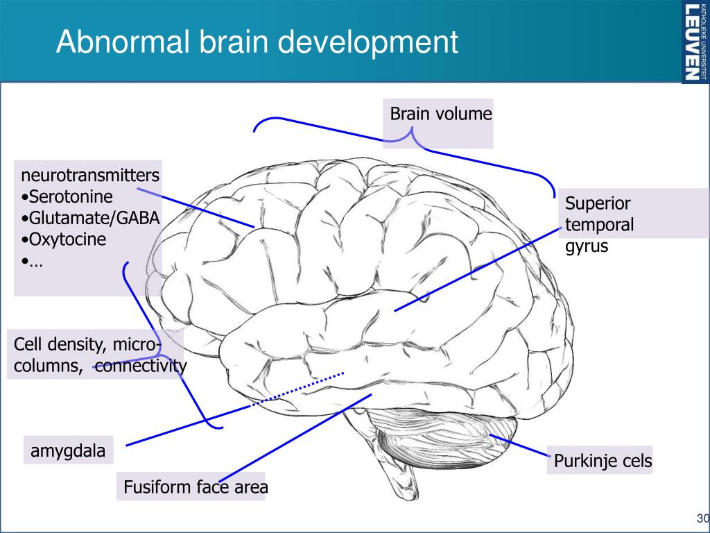 Abnormalbraindevelopment Brain volume • neurotransmitters • Serotonine • Glutamate/GABA • Oxytocine • … Superior temporal gyrus Celldensity, micro- columns, connectivity amygdala Purkinjecels Fusiform face area