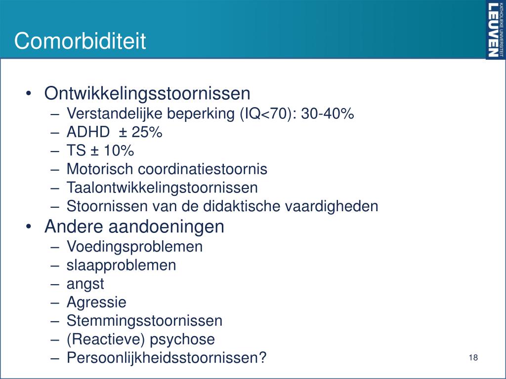 Comorbiditeit • Ontwikkelingsstoornissen • Verstandelijkebeperking (IQ<70): 30-40% • ADHD ± 25% • TS ±10% • Motorischcoordinatiestoornis • Taalontwikkelingstoornissen • Stoornissen van de didaktischevaardigheden • Andereaandoeningen • Voedingsproblemen • slaapproblemen • angst • Agressie • Stemmingsstoornissen • (Reactieve) psychose • Persoonlijkheidsstoornissen?