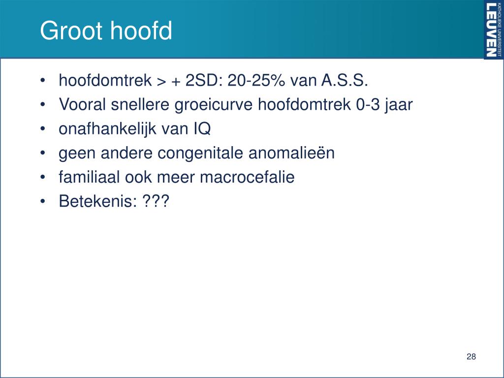 Groot hoofd hoofdomtrek > + 2SD: 20-25% van A.S.S. Vooral snellere groeicurve hoofdomtrek 0-3 jaar onafhankelijk van IQ geen andere congenitale anomalieën familiaal ook meer macrocefalie Betekenis: ???
