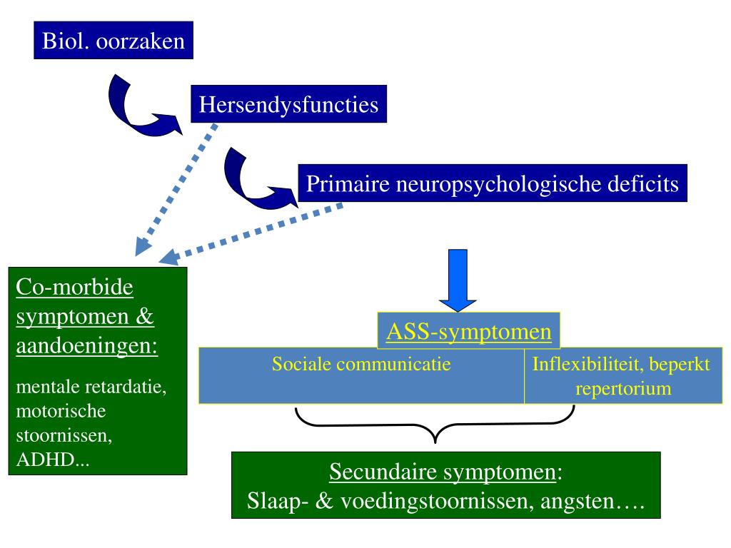 Hersendysfuncties Primaire neuropsychologische deficits ASS-symptomen Biol. oorzaken Co-morbide symptomen & aandoeningen: mentale retardatie, motorische stoornissen, ADHD... Sociale communicatie Inflexibiliteit, beperkt repertorium Secundaire symptomen: Slaap- & voedingstoornissen, angsten….