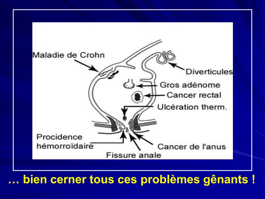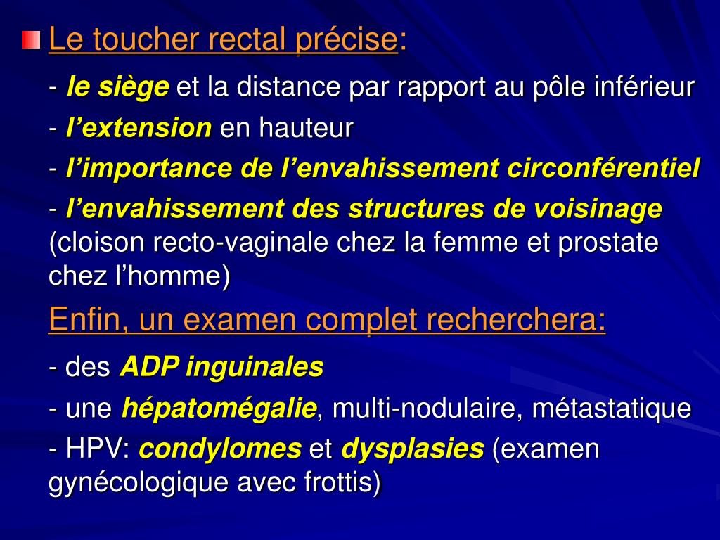 Le toucher rectal précise: - lesiègeet la distance par rapport au pôle inférieur - l’extensionen hauteur - l’importance del’envahissement circonférentiel - l’envahissement des structures de voisinage (cloison recto-vaginale chez la femme et prostate chez l’homme) Enfin, un examen complet recherchera: - des ADP inguinales - une hépatomégalie, multi-nodulaire, métastatique - HPV: condylomesetdysplasies(examen gynécologique avec frottis)