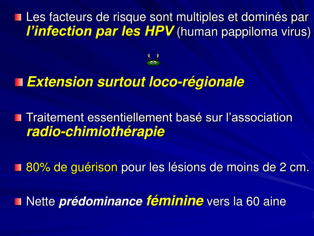 Les facteurs de risque sont multiples et dominés par l’infection par les HPV (human pappiloma virus) • Extension surtout loco-régionale • Traitement essentiellement basé sur l’association radio-chimiothérapie • 80% de guérison pour les lésions de moins de 2 cm. • Nette prédominance fémininevers la 60 aine