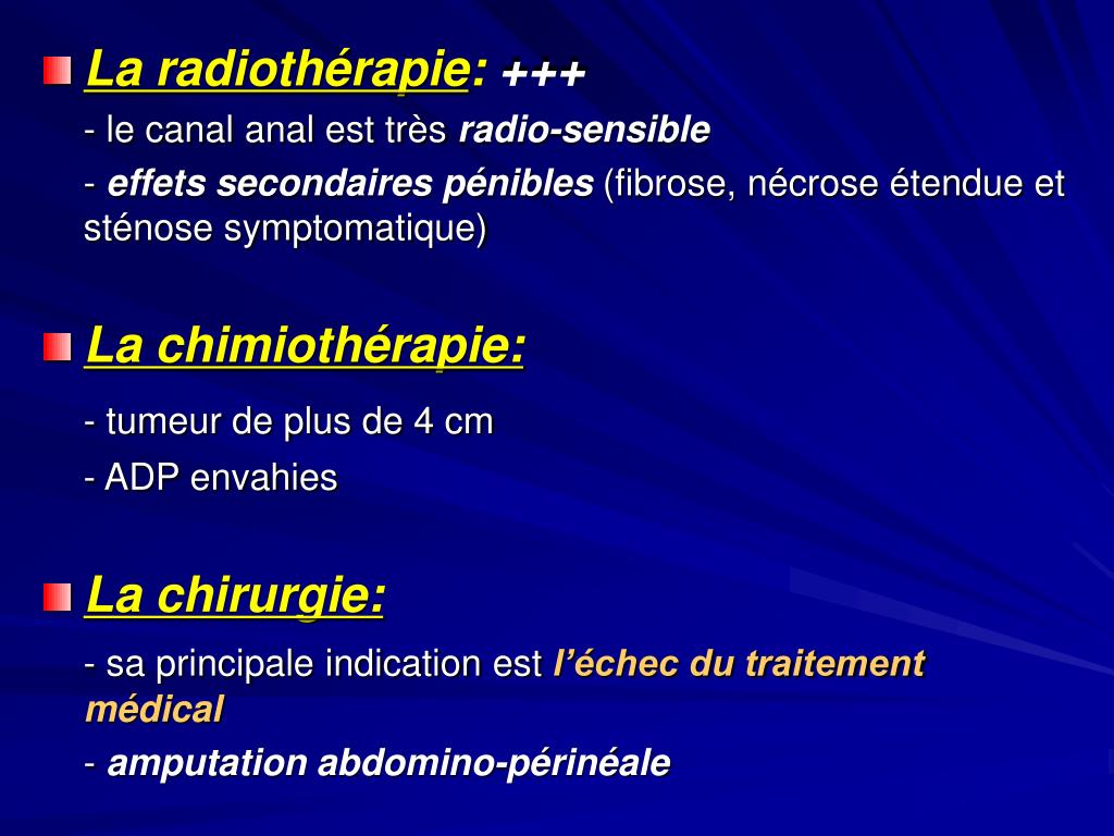La radiothérapie: +++ - le canal anal est très radio-sensible - effets secondaires pénibles (fibrose, nécrose étendue et sténose symptomatique) • La chimiothérapie: - tumeur de plus de 4 cm - ADP envahies • La chirurgie: - sa principale indication est l’échec du traitement médical - amputation abdomino-périnéale