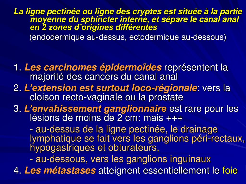 La ligne pectinée ou ligne des cryptes est située à la partie moyenne du sphincter interne, et sépare le canal anal en 2 zones d’origines différentes (endodermique au-dessus, ectodermique au-dessous) 1. Lescarcinomes épidermoïdesreprésentent la majorité des cancers du canal anal 2. L’extension est surtout loco-régionale: vers la cloison recto-vaginale ou la prostate 3. L’envahissement ganglionnaire est rare pour les lésions de moins de 2 cm: mais +++ - au-dessus de la ligne pectinée, le drainage lymphatique se fait vers les ganglions péri-rectaux, hypogastriques et obturateurs, - au-dessous, vers les ganglions inguinaux 4. Les métastasesatteignent essentiellement le foie