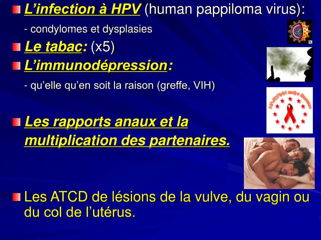 L’infection à HPV (human pappiloma virus): - condylomes et dysplasies • Le tabac: (x5) • L’immunodépression: - qu’elle qu’en soit la raison (greffe, VIH) • Les rapports anaux et la multiplication des partenaires. • Les ATCD de lésions de la vulve, du vagin ou du col de l’utérus.