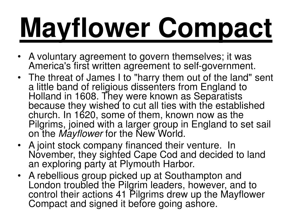 Mayflower Compact • A voluntary agreement to govern themselves; it was America's first written agreement to self-government. • The threat of James I to "harry them out of the land" sent a little band of religious dissenters from England to Holland in 1608. They were known as Separatists because they wished to cut all ties with the established church. In 1620, some of them, known now as the Pilgrims, joined with a larger group in England to set sail on the Mayflower for the New World. • A joint stock company financed their venture. In November, they sighted Cape Cod and decided to land an exploring party at Plymouth Harbor. • A rebellious group picked up at Southampton and London troubled the Pilgrim leaders, however, and to control their actions 41 Pilgrims drew up the Mayflower Compact and signed it before going ashore.