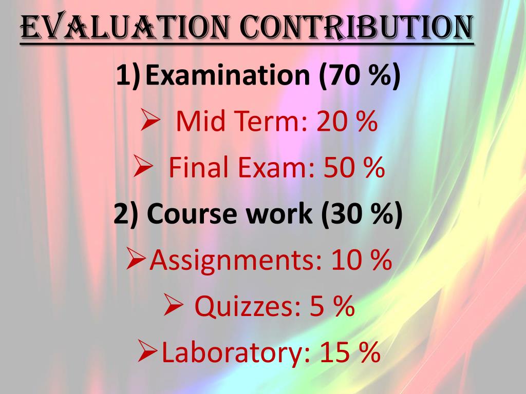 Evaluation contribution • Examination (70 %) • Mid Term: 20 % • Final Exam: 50 % 2) Course work (30 %) • Assignments: 10 % • Quizzes: 5 % • Laboratory: 15 %