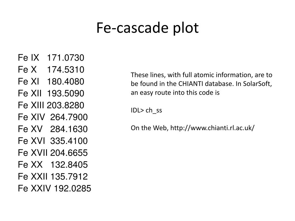Fe-cascade plot Fe IX 171.0730 Fe X 174.5310 Fe XI 180.4080 Fe XII 193.5090 Fe XIII 203.8280 Fe XIV 264.7900 Fe XV 284.1630 Fe XVI 335.4100 Fe XVII 204.6655 Fe XX 132.8405 Fe XXII 135.7912 Fe XXIV 192.0285 These lines, with full atomic information, are to be found in the CHIANTI database. In SolarSoft, an easy route into this code is IDL> ch_ss On the Web, http://www.chianti.rl.ac.uk/