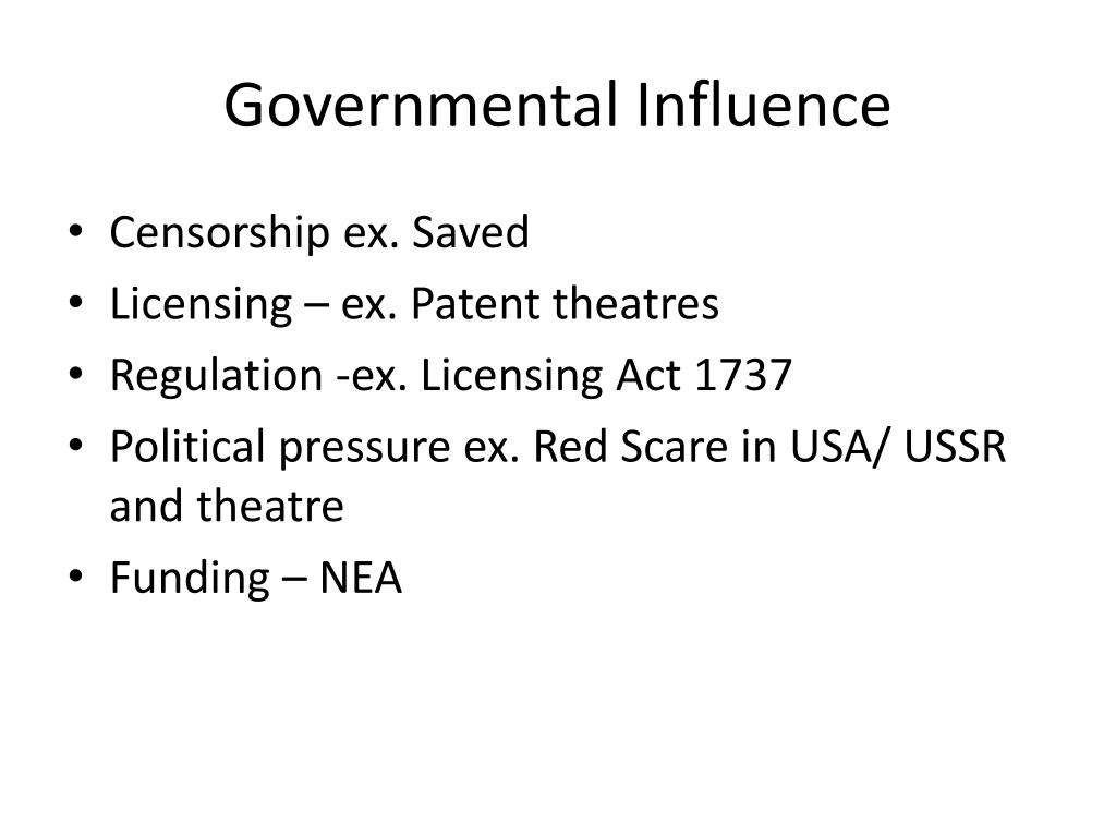 Governmental Influence • Censorship ex. Saved • Licensing – ex. Patent theatres • Regulation -ex. Licensing Act 1737 • Political pressure ex. Red Scare in USA/ USSR and theatre • Funding – NEA