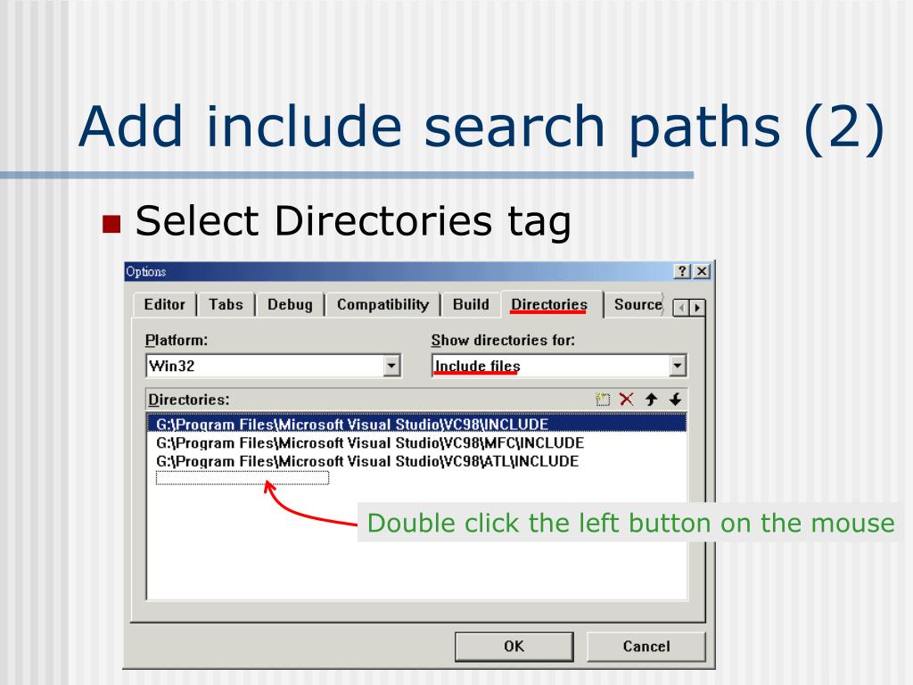 Add include search paths (2) • Select Directories tag Double click the left button on the mouse