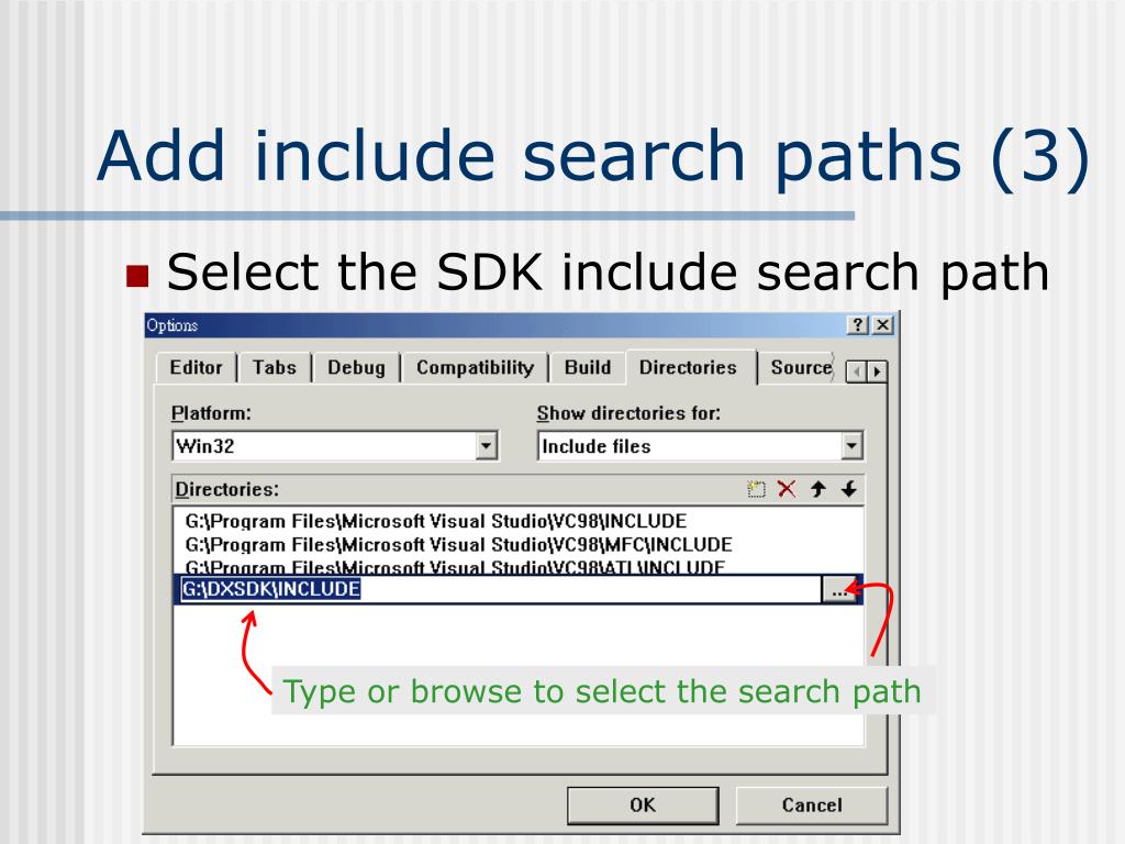Add include search paths (3) • Select the SDK include search path Type or browse to select the search path
