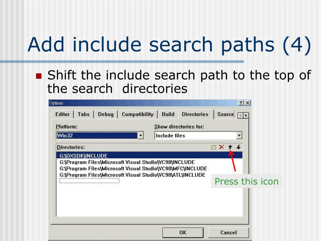 Add include search paths (4) • Shift the include search path to the top of the search directories Press this icon