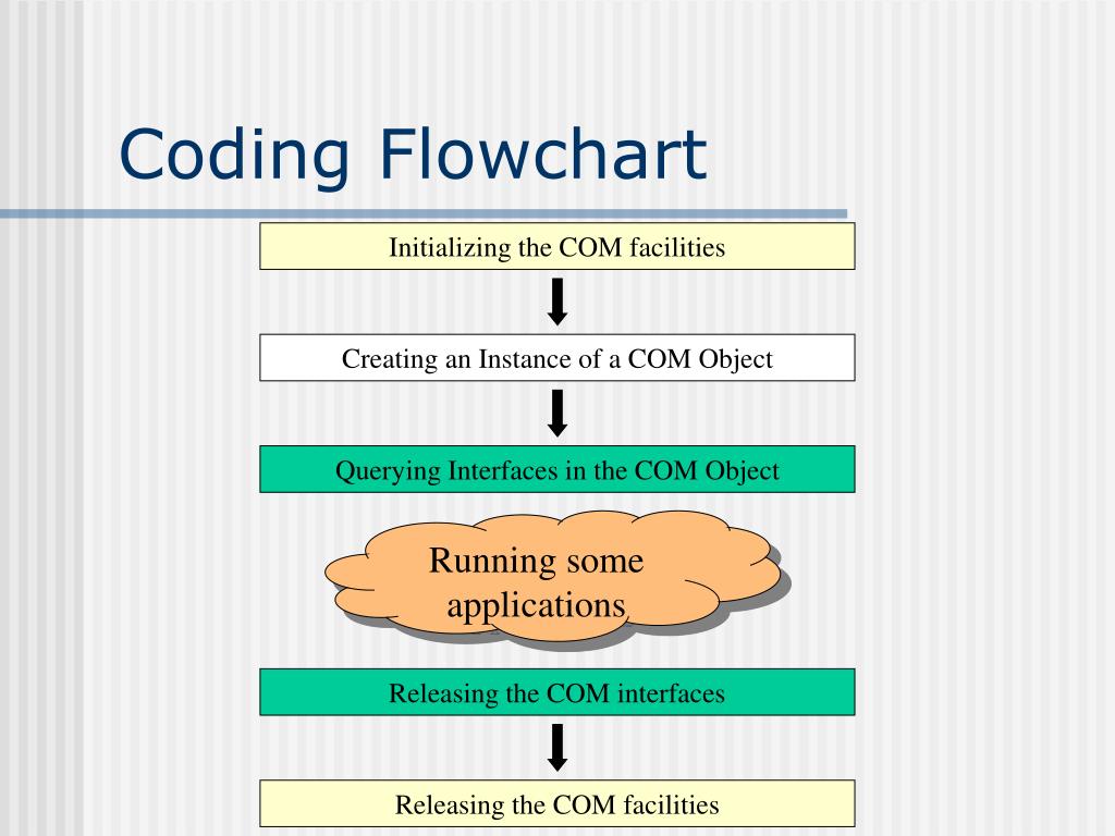 Coding Flowchart Initializing the COM facilities Creating an Instance of a COM Object Querying Interfaces in the COM Object Running some applications Releasing the COM interfaces Releasing the COM facilities