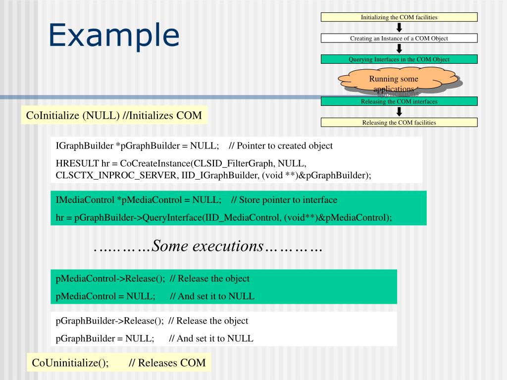 Initializing the COM facilities Creating an Instance of a COM Object Querying Interfaces in the COM Object Running some applications Releasing the COM interfaces Releasing the COM facilities Example CoInitialize (NULL) //Initializes COM Interface name IGraphBuilder *pGraphBuilder = NULL; // Pointer to created object HRESULT hr = CoCreateInstance(CLSID_FilterGraph, NULL, CLSCTX_INPROC_SERVER, IID_IGraphBuilder, (void **)&pGraphBuilder); IMediaControl *pMediaControl = NULL; // Store pointer to interface hr = pGraphBuilder->QueryInterface(IID_MediaControl, (void**)&pMediaControl); .…..……Some executions………… pMediaControl->Release(); // Release the object pMediaControl = NULL; // And set it to NULL pGraphBuilder->Release(); // Release the object pGraphBuilder = NULL; // And set it to NULL CoUninitialize(); // Releases COM