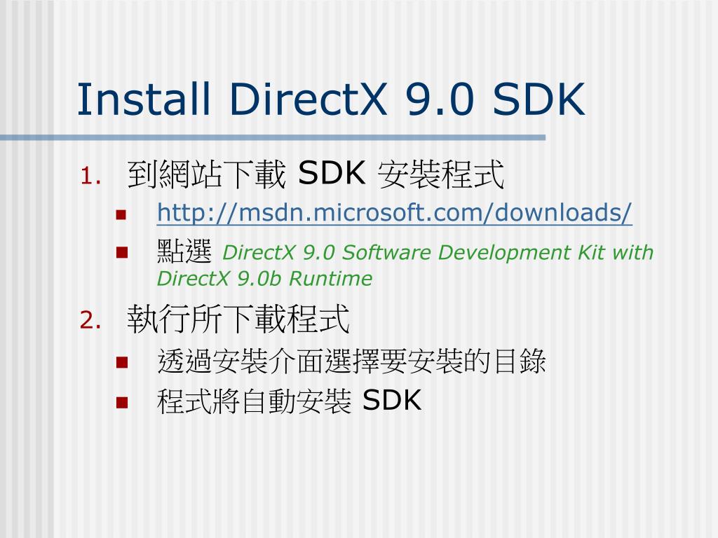 Install DirectX 9.0 SDK • 到網站下載 SDK 安裝程式 • http://msdn.microsoft.com/downloads/ • 點選 DirectX 9.0 Software Development Kit with DirectX 9.0b Runtime • 執行所下載程式 • 透過安裝介面選擇要安裝的目錄 • 程式將自動安裝 SDK