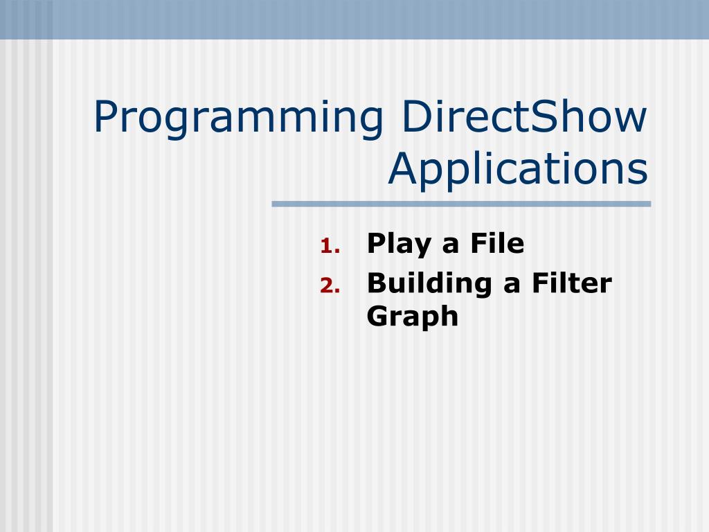 1. Play a File #include <dshow.h> void main(void) { IGraphBuilder *pGraph; IMediaControl *pMediaControl; //Handles media streaming in the filter graph IMediaEvent *pEvent; //Handles filter graph events Create the COM object CoInitialize(NULL); // Create the filter graph manager and query for interfaces. CoCreateInstance(CLSID_FilterGraph, NULL, CLSCTX_INPROC_SERVER, IID_IGraphBuilder, (void **)&pGraph); Query Interfaces in the COM object pGraph->QueryInterface(IID_IMediaControl, (void **)&pMediaControl); pGraph->QueryInterface(IID_IMediaEvent, (void **)&pEvent);