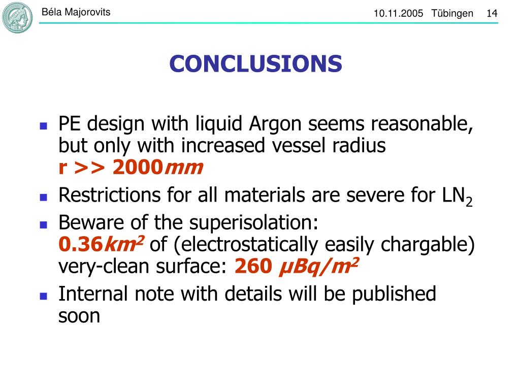 CONCLUSIONS • PE design with liquid Argon seems reasonable, but only with increased vessel radius r >> 2000mm • Restrictions for all materials are severe for LN2 • Beware of the superisolation: 0.36km2 of (electrostatically easily chargable) very-clean surface: 260 μBq/m2 • Internal note with details will be published soon