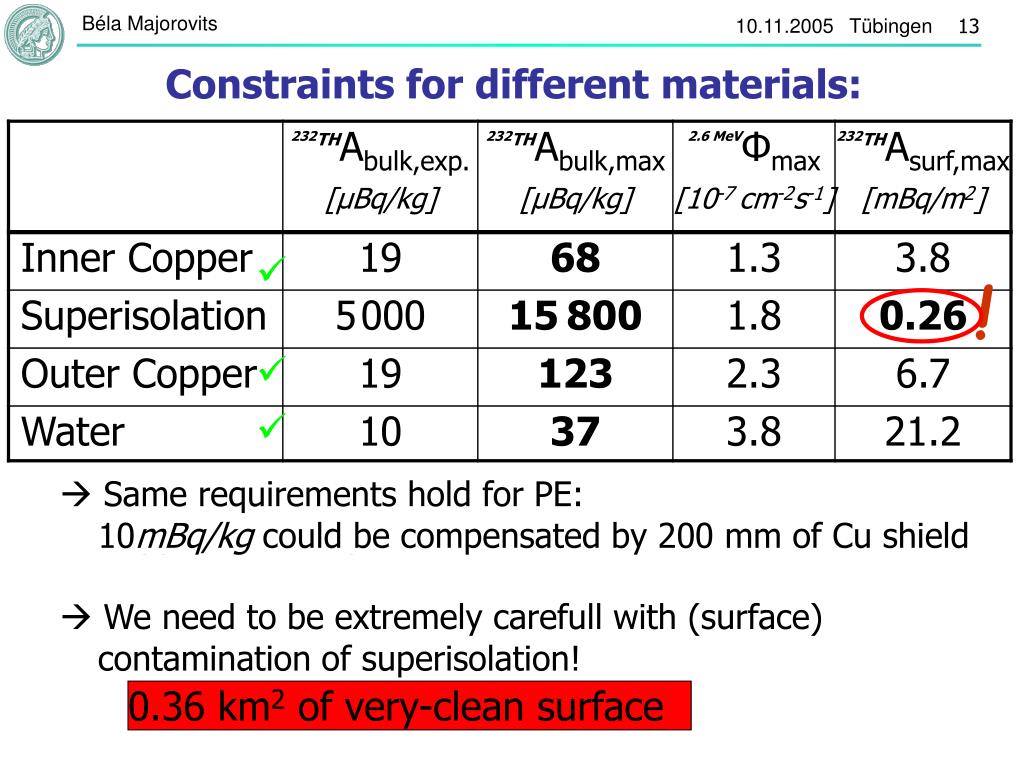! We need to be extremely carefull with (surface) contamination of superisolation! 0.36 km2 of very-clean surface Constraints for different materials: Water needs to be of very high purity! doable: achieved for BOREXINO and SNO Same requirements hold for PE: 10mBq/kg could be compensated by 200 mm of Cu shield Copper has to be pure, but OF01 and NOSV copper meet requirements