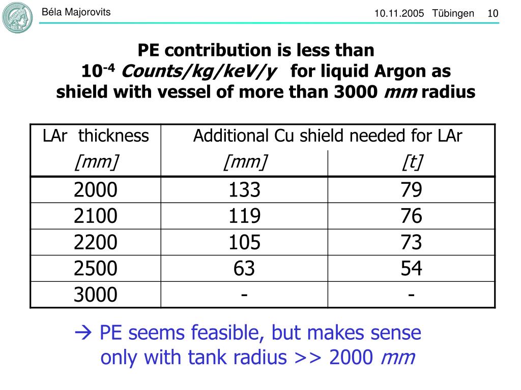 Expected background contribution of PE with 2 m LAr tank 2.6MeVAPE = 10 mBq/kg 2.6MeVBPE= 1.9 * 10-2 Counts/kg/keV/y Reduction of factor 190 required in order to meet the requirement of 10-4Counts/kg/keV/y r = e -μCu L Cu= 1/190 we need to have additional copper shield of dCu,ana=133 mm Independent cross check with MC simulation: dCu,sim=138 mm