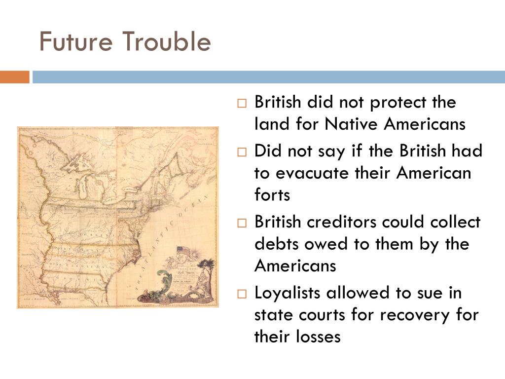 Future Trouble • British did not protect the land for Native Americans • Did not say if the British had to evacuate their American forts • British creditors could collect debts owed to them by the Americans • Loyalists allowed to sue in state courts for recovery for their losses
