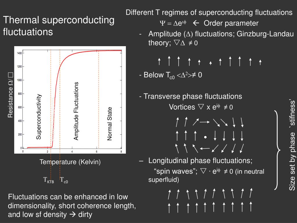 Different T regimes of superconducting fluctuations • e Order parameter • Amplitude ( fluctuations; Ginzburg-Landau theory; ≠ 0 • - Below Tc0<2>≠ 0 • - Transverse phase fluctuations • Vortices xei≠ 0 • Longitudinal phase fluctuations; • “spin waves”; .ei≠ 0 (in neutral superfluid) Thermal superconducting fluctuations c ResistanceW/ Amplitude Fluctuations Phase Fluctuations Superconductivity Normal State Size set by phase `stifness’ Temperature (Kelvin) TKTB Tc0 Fluctuations can be enhanced in low dimensionality, short coherence length, and low sf density dirty
