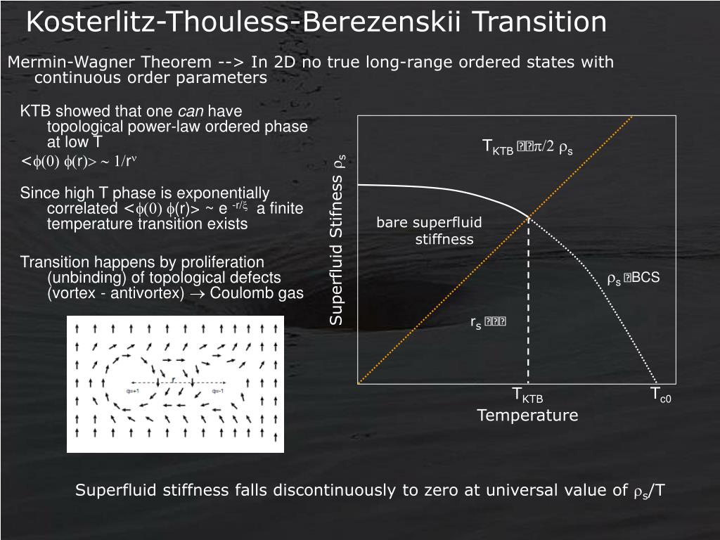 Kosterlitz-Thouless-Berezenskii Transition Mermin-Wagner Theorem --> In 2D no true long-range ordered states with continuous order parameters KTB showed that one can have topological power-law ordered phase at low T < rr Since high T phase is exponentially correlated < (r)> ~ e -r/ a finite temperature transition exists Transition happens by proliferation (unbinding) of topological defects (vortex - antivortex) Coulomb gas TKTB p/2 rs bare superfluid stiffness Superfluid Stifness s rsBCS rs Tc0 TKTB Temperature Superfluid stiffness falls discontinuously to zero at universal value of s/T