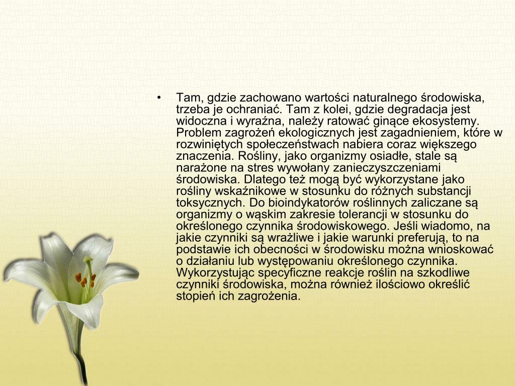 Tam, gdzie zachowano wartości naturalnego środowiska, trzeba je ochraniać. Tam z kolei, gdzie degradacja jest widoczna i wyraźna, należy ratować ginące ekosystemy. Problem zagrożeń ekologicznych jest zagadnieniem, które w rozwiniętych społeczeństwach nabiera coraz większego znaczenia. Rośliny, jako organizmy osiadłe, stale są narażone na stres wywołany zanieczyszczeniami środowiska. Dlatego też mogą być wykorzystane jako rośliny wskaźnikowe w stosunku do różnych substancji toksycznych. Do bioindykatorów roślinnych zaliczane są organizmy o wąskim zakresie tolerancji w stosunku do określonego czynnika środowiskowego. Jeśli wiadomo, na jakie czynniki są wrażliwe i jakie warunki preferują, to na podstawie ich obecności w środowisku można wnioskować o działaniu lub występowaniu określonego czynnika. Wykorzystując specyficzne reakcje roślin na szkodliwe czynniki środowiska, można również ilościowo określić stopień ich zagrożenia.