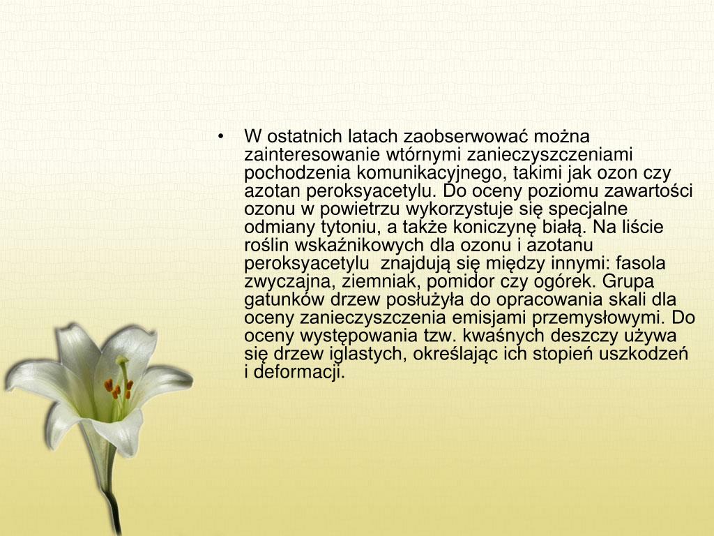 W ostatnich latach zaobserwować można zainteresowanie wtórnymi zanieczyszczeniami pochodzenia komunikacyjnego, takimi jak ozon czy azotan peroksyacetylu. Do oceny poziomu zawartości ozonu w powietrzu wykorzystuje się specjalne odmiany tytoniu, a także koniczynę białą. Na liście roślin wskaźnikowych dla ozonu i azotanu peroksyacetylu znajdują się między innymi: fasola zwyczajna, ziemniak, pomidor czy ogórek. Grupa gatunków drzew posłużyła do opracowania skali dla oceny zanieczyszczenia emisjami przemysłowymi. Do oceny występowania tzw. kwaśnych deszczy używa się drzew iglastych, określając ich stopień uszkodzeń i deformacji.