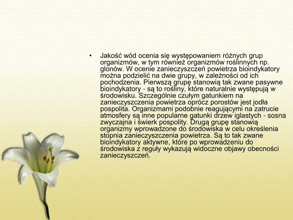 Jakość wód ocenia się występowaniem różnych grup organizmów, w tym również organizmów roślinnych np. glonów. W ocenie zanieczyszczeń powietrza bioindykatory można podzielić na dwie grupy, w zależności od ich pochodzenia. Pierwszą grupę stanowią tak zwane pasywne bioindykatory - są to rośliny, które naturalnie występują w środowisku. Szczególnie czułym gatunkiem na zanieczyszczenia powietrza oprócz porostów jest jodła pospolita. Organizmami podobnie reagującymi na zatrucie atmosfery są inne popularne gatunki drzew iglastych - sosna zwyczajna i świerk pospolity. Drugą grupę stanowią organizmy wprowadzone do środowiska w celu określenia stopnia zanieczyszczenia powietrza. Są to tak zwane bioindykatory aktywne, które po wprowadzeniu do środowiska z reguły wykazują widoczne objawy obecności zanieczyszczeń.