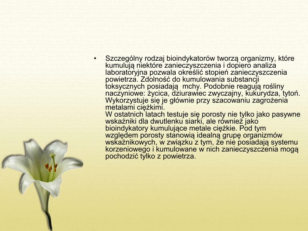 Szczególny rodzaj bioindykatorów tworzą organizmy, które kumulują niektóre zanieczyszczenia i dopiero analiza laboratoryjna pozwala określić stopień zanieczyszczenia powietrza. Zdolność do kumulowania substancji toksycznych posiadają mchy. Podobnie reagują rośliny naczyniowe: życica, dziurawiec zwyczajny, kukurydza, tytoń. Wykorzystuje się je głównie przy szacowaniu zagrożenia metalami ciężkimi.W ostatnich latach testuje się porosty nie tylko jako pasywne wskaźniki dla dwutlenku siarki, ale również jako bioindykatory kumulujące metale ciężkie. Pod tym względem porosty stanowią idealną grupę organizmów wskaźnikowych, w związku z tym, że nie posiadają systemu korzeniowego i kumulowane w nich zanieczyszczenia mogą pochodzić tylko z powietrza.