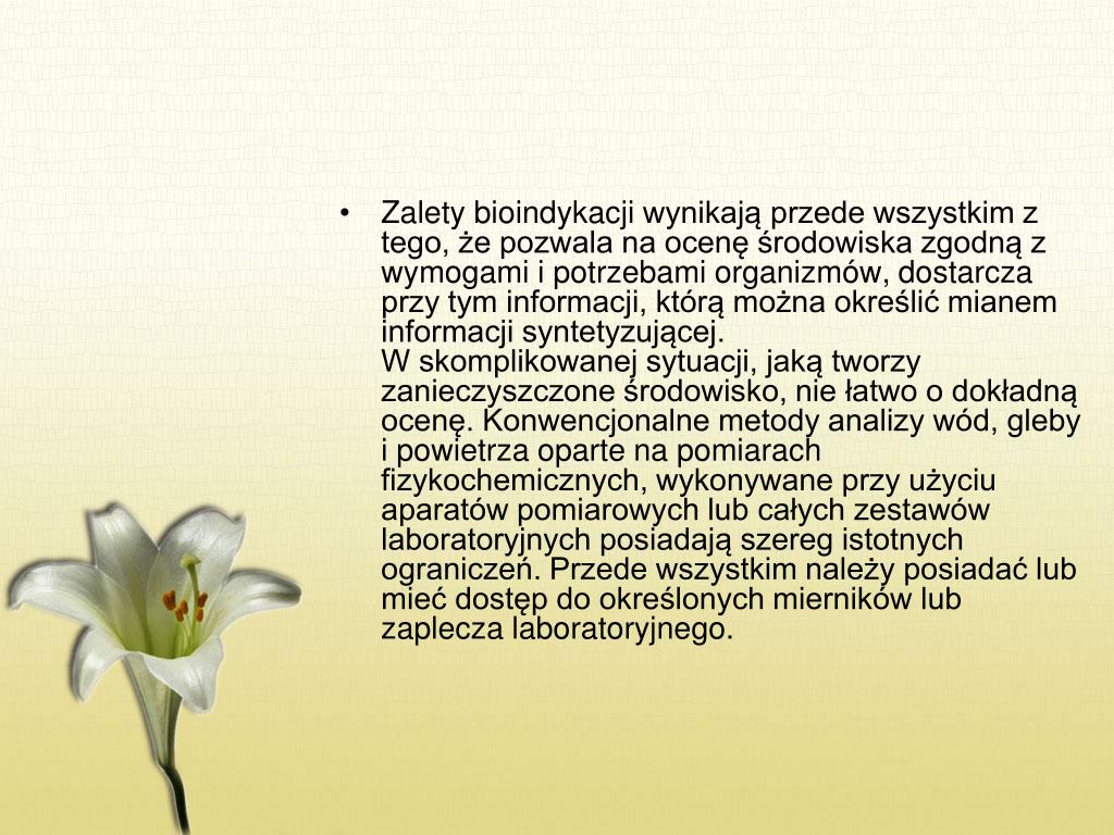 Zalety bioindykacji wynikają przede wszystkim z tego, że pozwala na ocenę środowiska zgodną z wymogami i potrzebami organizmów, dostarcza przy tym informacji, którą można określić mianem informacji syntetyzującej.W skomplikowanej sytuacji, jaką tworzy zanieczyszczone środowisko, nie łatwo o dokładną ocenę. Konwencjonalne metody analizy wód, gleby i powietrza oparte na pomiarach fizykochemicznych, wykonywane przy użyciu aparatów pomiarowych lub całych zestawów laboratoryjnych posiadają szereg istotnych ograniczeń. Przede wszystkim należy posiadać lub mieć dostęp do określonych mierników lub zaplecza laboratoryjnego.