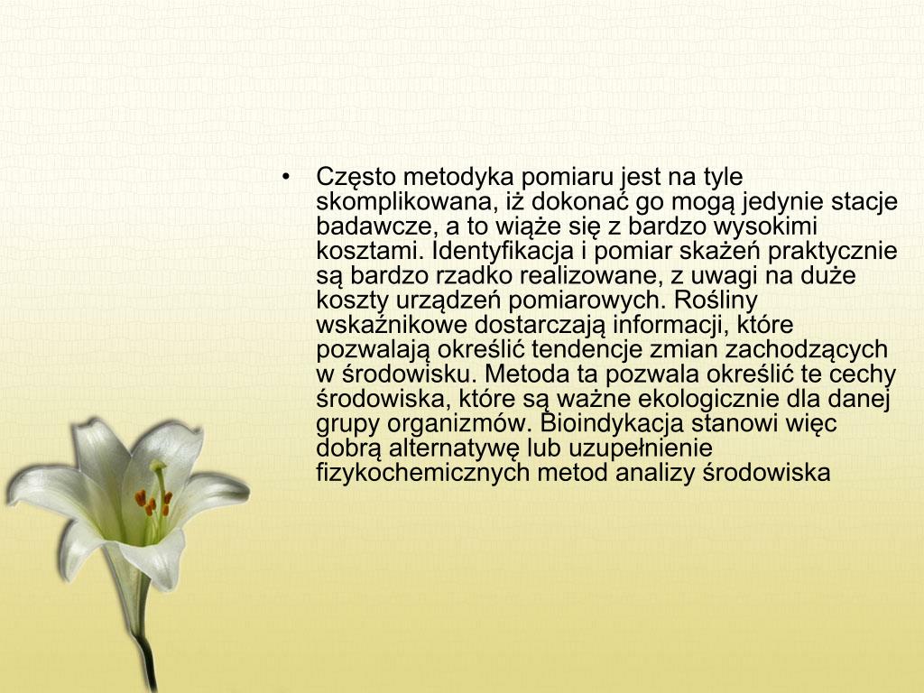 Często metodyka pomiaru jest na tyle skomplikowana, iż dokonać go mogą jedynie stacje badawcze, a to wiąże się z bardzo wysokimi kosztami. Identyfikacja i pomiar skażeń praktycznie są bardzo rzadko realizowane, z uwagi na duże koszty urządzeń pomiarowych. Rośliny wskaźnikowe dostarczają informacji, które pozwalają określić tendencje zmian zachodzących w środowisku. Metoda ta pozwala określić te cechy środowiska, które są ważne ekologicznie dla danej grupy organizmów. Bioindykacja stanowi więc dobrą alternatywę lub uzupełnienie fizykochemicznych metod analizy środowiska