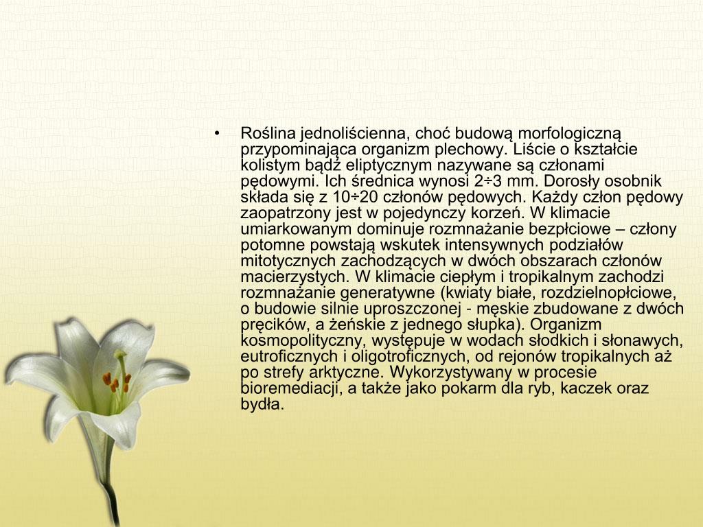 Roślina jednoliścienna, choć budową morfologiczną przypominająca organizm plechowy. Liście o kształcie kolistym bądź eliptycznym nazywane są członami pędowymi. Ich średnica wynosi 2÷3 mm. Dorosły osobnik składa się z 10÷20 członów pędowych. Każdy człon pędowy zaopatrzony jest w pojedynczy korzeń. W klimacie umiarkowanym dominuje rozmnażanie bezpłciowe – człony potomne powstają wskutek intensywnych podziałów mitotycznych zachodzących w dwóch obszarach członów macierzystych. W klimacie ciepłym i tropikalnym zachodzi rozmnażanie generatywne (kwiaty białe, rozdzielnopłciowe, o budowie silnie uproszczonej - męskie zbudowane z dwóch pręcików, a żeńskie z jednego słupka). Organizm kosmopolityczny, występuje w wodach słodkich i słonawych, eutroficznych i oligotroficznych, od rejonów tropikalnych aż po strefy arktyczne. Wykorzystywany w procesie bioremediacji, a także jako pokarm dla ryb, kaczek oraz bydła.