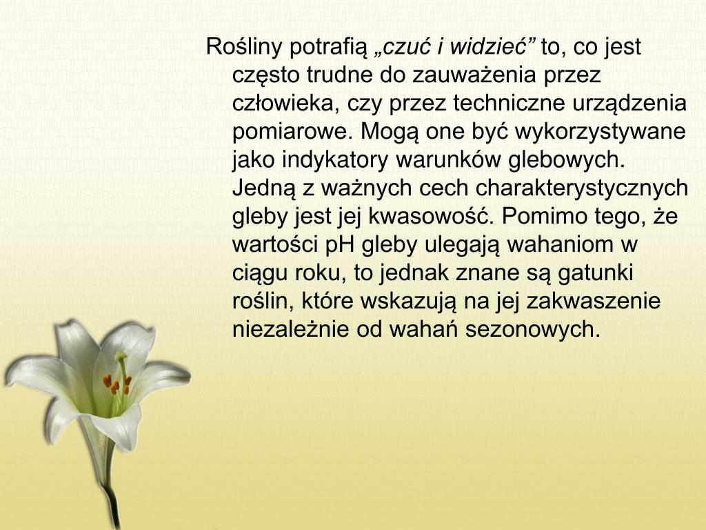Rośliny potrafią „czuć i widzieć” to, co jest często trudne do zauważenia przez człowieka, czy przez techniczne urządzenia pomiarowe. Mogą one być wykorzystywane jako indykatory warunków glebowych. Jedną z ważnych cech charakterystycznych gleby jest jej kwasowość. Pomimo tego, że wartości pH gleby ulegają wahaniom w ciągu roku, to jednak znane są gatunki roślin, które wskazują na jej zakwaszenie niezależnie od wahań sezonowych.