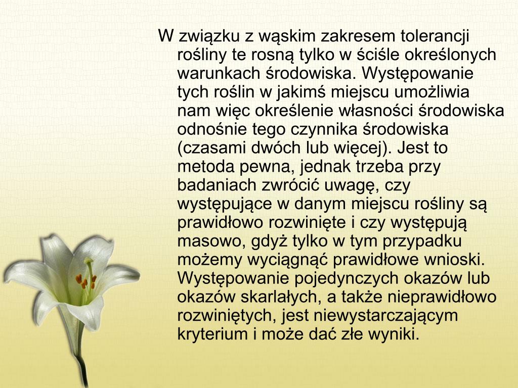 W związku z wąskim zakresem tolerancji rośliny te rosną tylko w ściśle określonych warunkach środowiska. Występowanie tych roślin w jakimś miejscu umożliwia nam więc określenie własności środowiska odnośnie tego czynnika środowiska (czasami dwóch lub więcej). Jest to metoda pewna, jednak trzeba przy badaniach zwrócić uwagę, czy występujące w danym miejscu rośliny są prawidłowo rozwinięte i czy występują masowo, gdyż tylko w tym przypadku możemy wyciągnąć prawidłowe wnioski. Występowanie pojedynczych okazów lub okazów skarlałych, a także nieprawidłowo rozwiniętych, jest niewystarczającym kryterium i może dać złe wyniki.