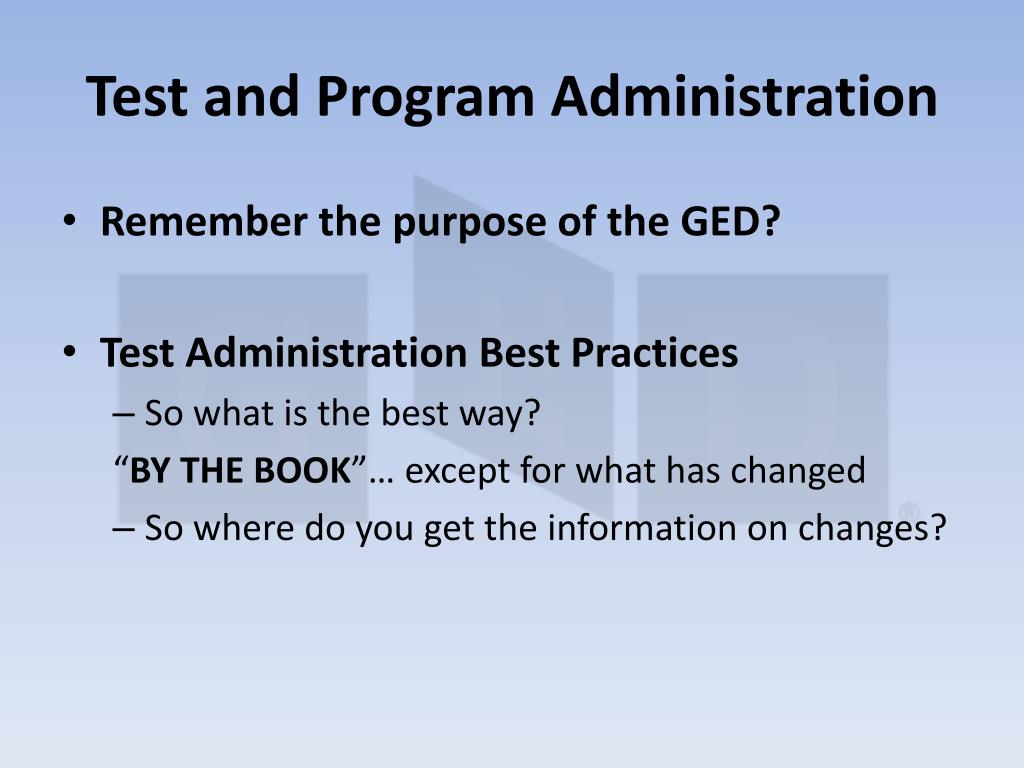 Test and Program Administration. Refresher training for Chief Examiners New Examiners initial training. Test and Program Administration. Remember the purpose of the GED? Test Administration Best Practices Program Administration Best Practices Where are WE… the discussion.