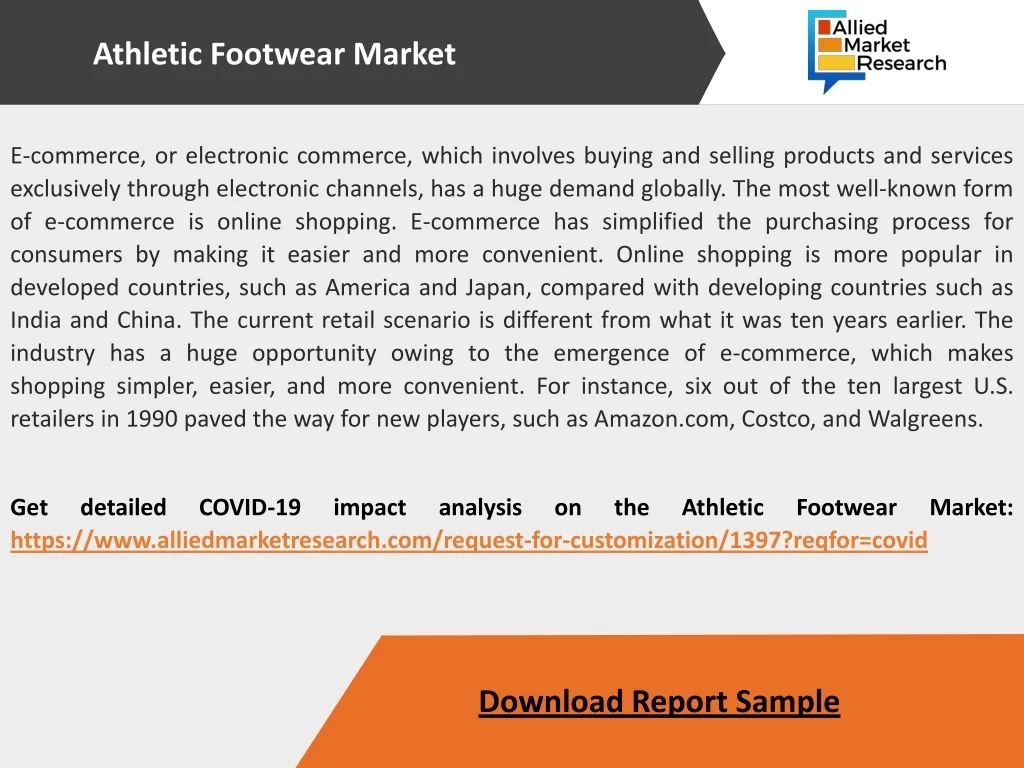 E-commerce, or electronic commerce, which involves buying and selling products and services exclusively through electronic channels, has a huge demand globally. The most well-known form of e-commerce is online shopping. E-commerce has simplified the purchasing process for consumers by making it easier and more convenient. Online shopping is more popular in developed countries, such as America and Japan, compared with developing countries such as India and China. The current retail scenario is different from what it was ten years earlier. The industry has a huge opportunity owing to the emergence of e-commerce, which makes shopping simpler, easier, and more convenient. For instance, six out of the ten largest U.S. retailers in 1990 paved the way for new players, such as Amazon.com, Costco, and Walgreens. • Get detailed COVID-19 impact analysis on the Athletic Footwear Market: https://www.alliedmarketresearch.com/request-for-customization/1397?reqfor=covid Athletic Footwear Market Download Report Sample