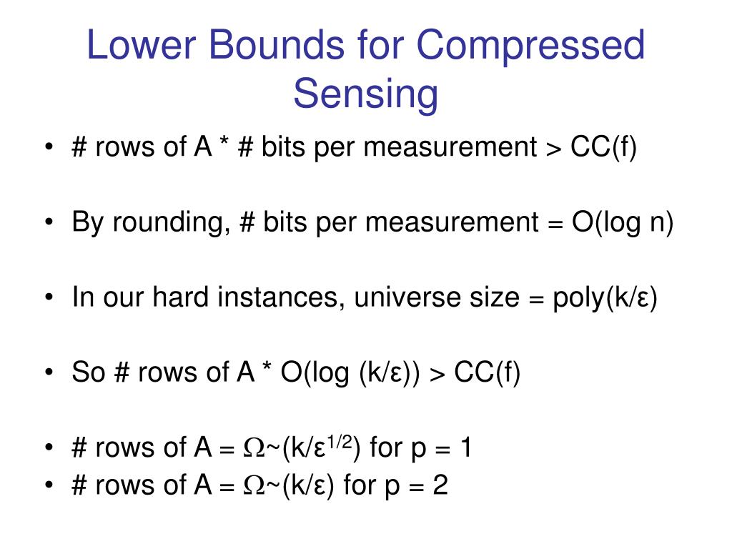 Lower Bounds for Compressed Sensing • # rows of A * # bits per measurement > CC(f) • By rounding, # bits per measurement = O(log n) • In our hard instances, universe size = poly(k/ε) • So # rows of A * O(log (k/ε)) > CC(f) • # rows of A = ~(k/ε1/2) for p = 1 • # rows of A = ~(k/ε) for p = 2