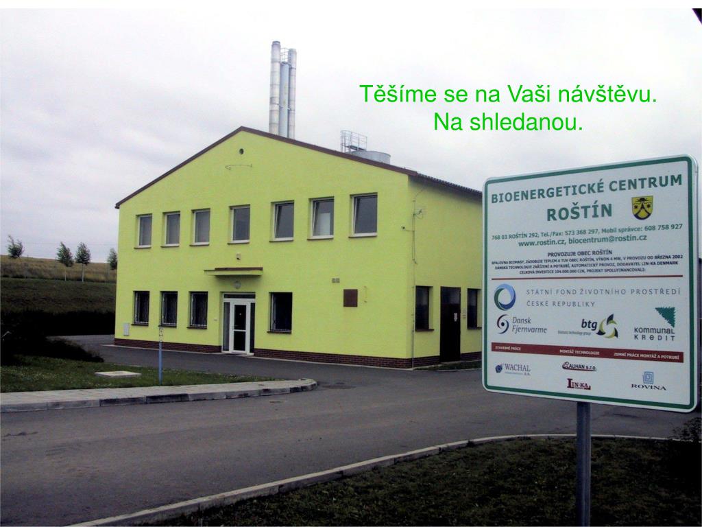 Bioenergetické centrum Roštín. adresa: 768 03 Roštín 292 tel/fax: +420 573 368 297 mobil: +420 608 758 927 web: www. biocentrum. rostin.cz e-mail: biocentrum@rostin.cz. „Bioenergetické centrum Roštín“ Kotelna na spalování obilné a řepkové slámy, dodávající teplo a TUV do celé obce.