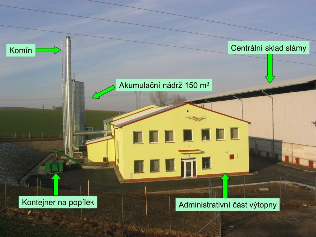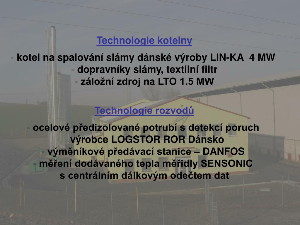 Technologie kotelny • kotel na spalování slámy dánské výroby LIN-KA 4 MW • dopravníky slámy, textilní filtr • záložní zdroj na LTO 1.5 MW • Technologie rozvodů • ocelové předizolované potrubí s detekcí poruch • výrobce LOGSTOR ROR Dánsko • výměníkové předávací stanice – DANFOS • měření dodávaného tepla měřidly SENSONIC • s centrálním dálkovým odečtem dat