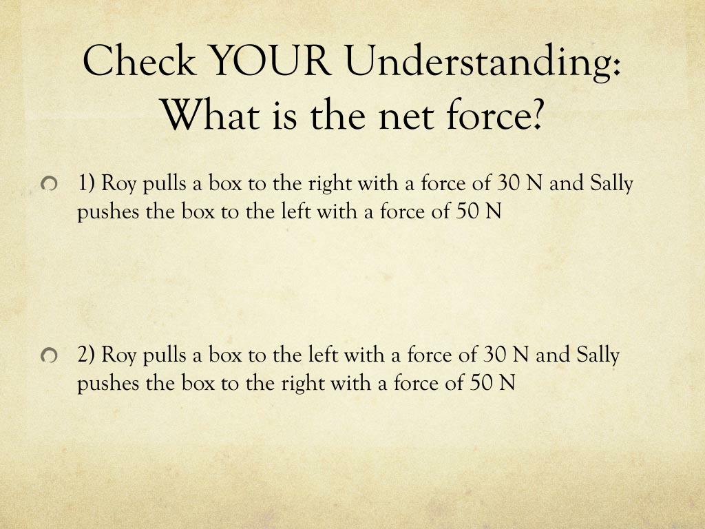 Check YOUR Understanding:What is the net force? • 1) Roy pulls a box to the right with a force of 30 N and Sally pushes the box to the left with a force of 50 N • 2) Roy pulls a box to the left with a force of 30 N and Sally pushes the box to the right with a force of 50 N