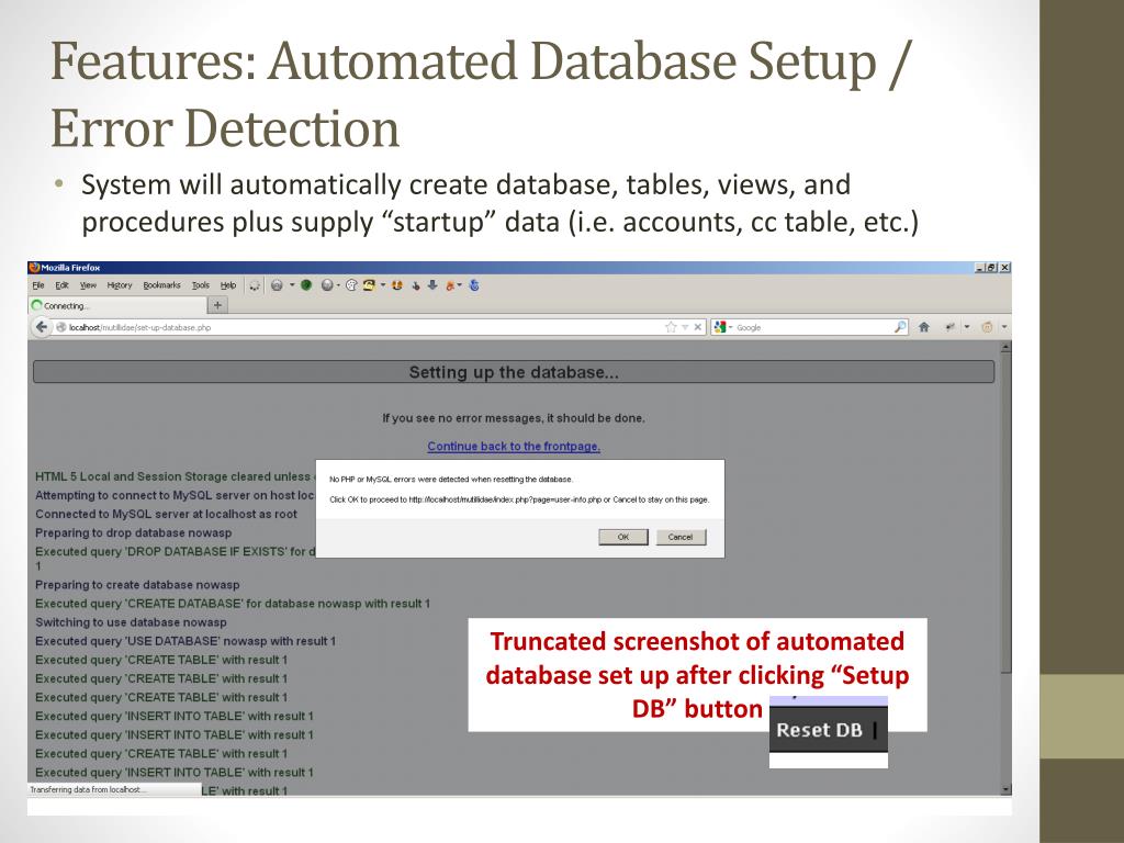 Features: Automated Database Setup / Error Detection • System will automatically create database, tables, views, and procedures plus supply “startup” data (i.e. accounts, cc table, etc.) Truncated screenshot of automated database set up after clicking “Setup DB” button