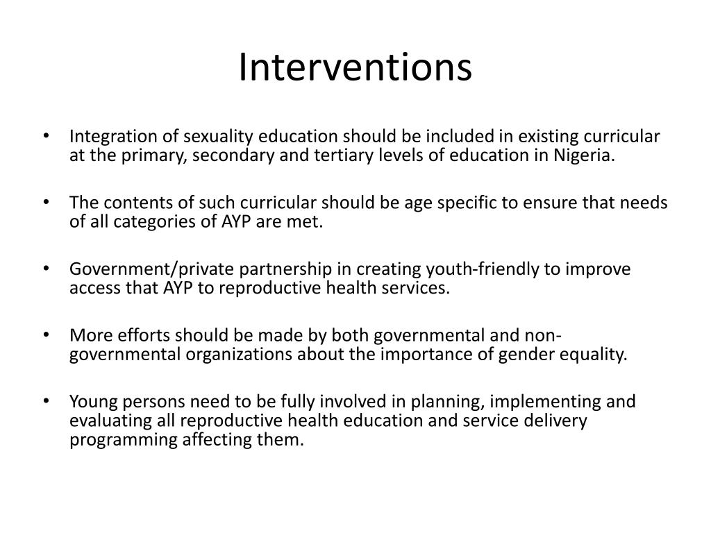 Interventions • Integration of sexuality education should be included in existing curricular at the primary, secondary and tertiary levels of education in Nigeria. • The contents of such curricular should be age specific to ensure that needs of all categories of AYP are met. • Government/private partnership in creating youth-friendly to improve access that AYP to reproductive health services. • More efforts should be made by both governmental and non-governmental organizations about the importance of gender equality. • Young persons need to be fully involved in planning, implementing and evaluating all reproductive health education and service delivery programming affecting them.