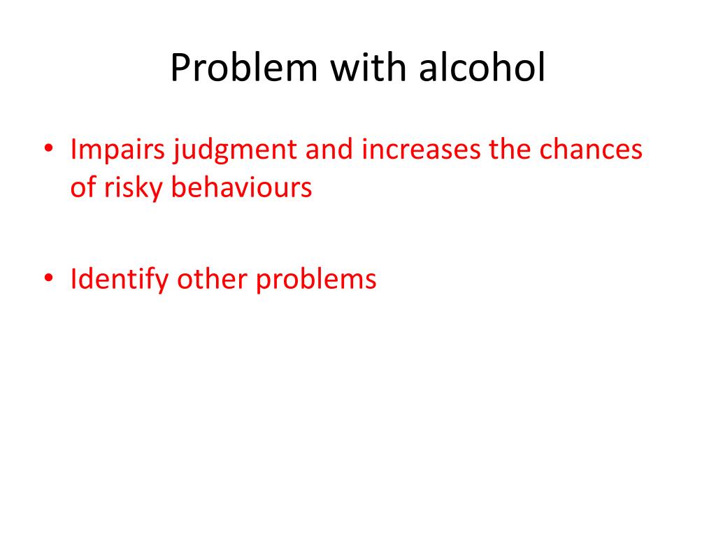 Problem with alcohol • Impairs judgment and increases the chances of risky behaviours • Identify other problems