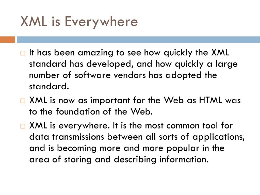 XML is Everywhere • It has been amazing to see how quickly the XML standard has developed, and how quickly a large number of software vendors has adopted the standard. • XML is now as important for the Web as HTML was to the foundation of the Web. • XML is everywhere. It is the most common tool for data transmissions between all sorts of applications, and is becoming more and more popular in the area of storing and describing information.