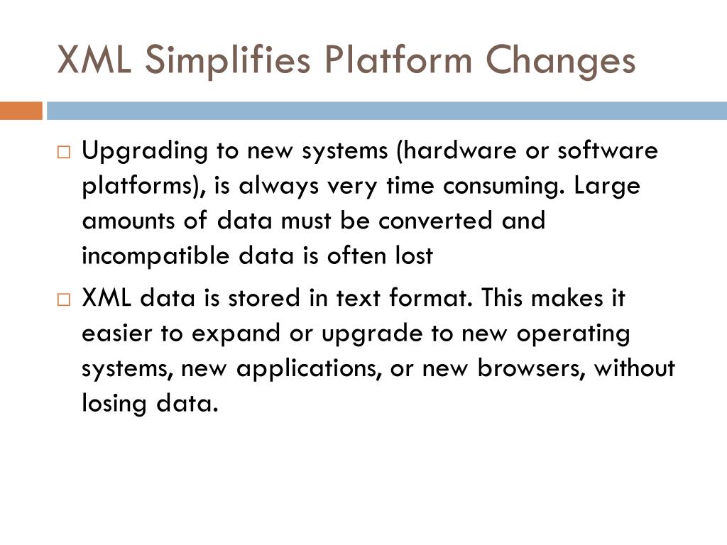 XML Simplifies Platform Changes • Upgrading to new systems (hardware or software platforms), is always very time consuming. Large amounts of data must be converted and incompatible data is often lost • XML data is stored in text format. This makes it easier to expand or upgrade to new operating systems, new applications, or new browsers, without losing data.