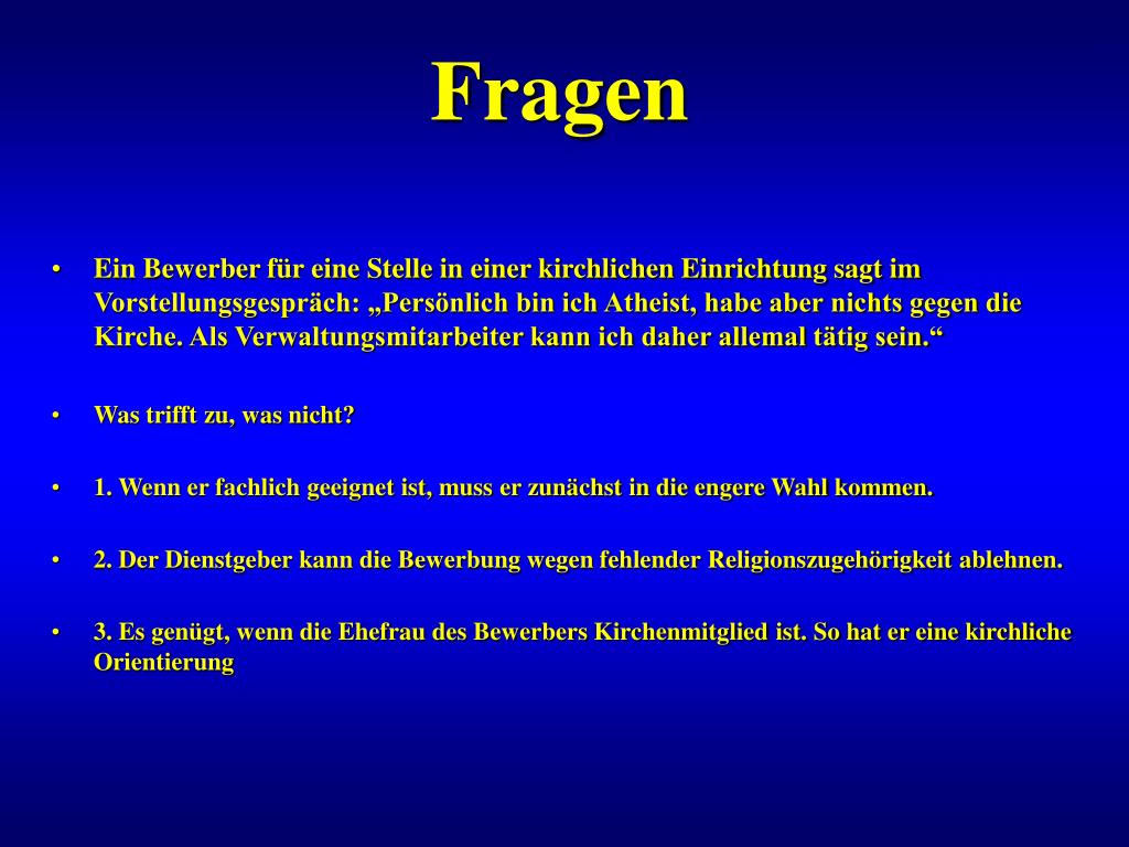 Fragen • Ein Bewerber für eine Stelle in einer kirchlichen Einrichtung sagt im Vorstellungsgespräch: „Persönlich bin ich Atheist, habe aber nichts gegen die Kirche. Als Verwaltungsmitarbeiter kann ich daher allemal tätig sein.“ • Was trifft zu, was nicht? • 1. Wenn er fachlich geeignet ist, muss er zunächst in die engere Wahl kommen. • 2. Der Dienstgeber kann die Bewerbung wegen fehlender Religionszugehörigkeit ablehnen. • 3. Es genügt, wenn die Ehefrau des Bewerbers Kirchenmitglied ist. So hat er eine kirchliche Orientierung