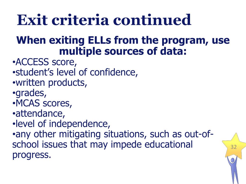 Exit criteria continued • When exiting ELLs from the program, use multiple sources of data: • ACCESS score, • student’s level of confidence, • written products, • grades, • MCAS scores, • attendance, • level of independence, • any other mitigating situations, such as out-of-school issues that may impede educational progress.
