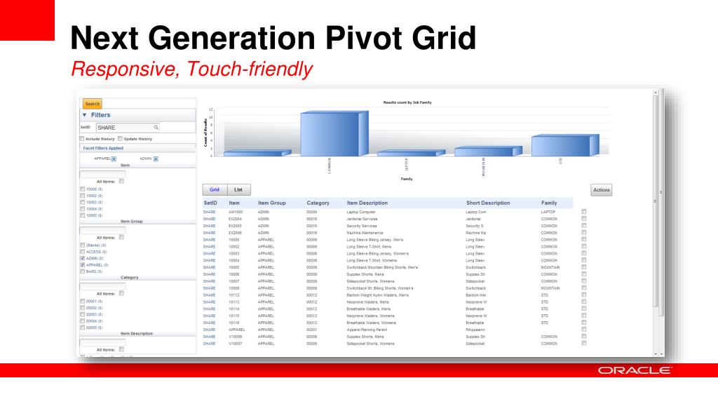 PeopleSoft + ReportingTechnology Strategy Pivot Grids • Much improved graphical charting, SVG, PNG • Related Actions integration • Pivoting in chart mode (not just grid) • Progressive filtering • Improved administration