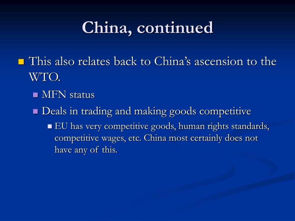 China, continued • This also relates back to China’s ascension to the WTO. • MFN status • Deals in trading and making goods competitive • EU has very competitive goods, human rights standards, competitive wages, etc. China most certainly does not have any of this.